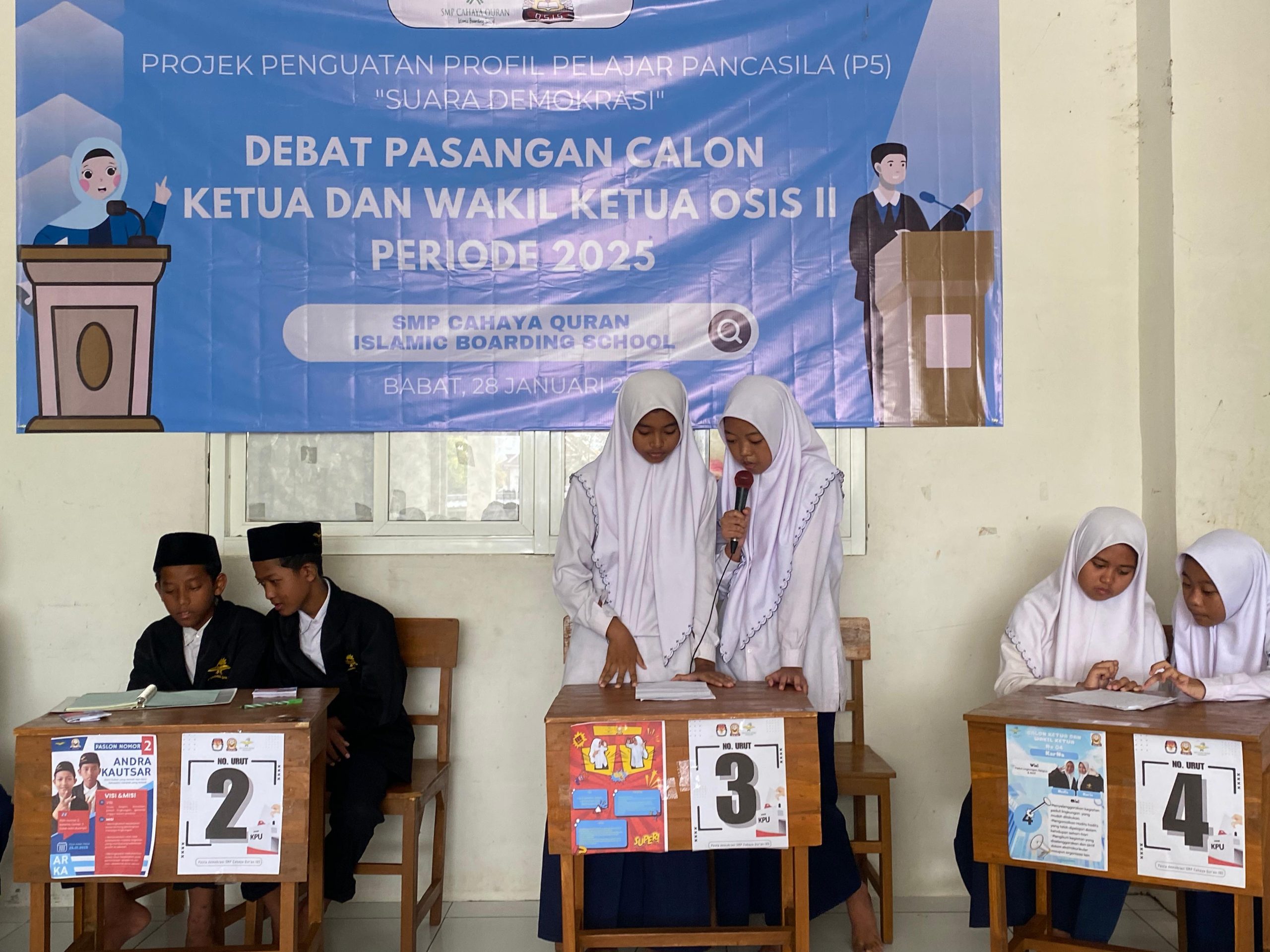 LAMONGAN – Debat kandidat calon ketua dan wakil ketua OSIS SMP Cahaya Quran Islamic Boarding School Babat Lamongan periode 2025/2026 berlangsung dinamis dan penuh semangat. Acara ini digelar di aula sekolah pada Selasa, 28 Januari 2025.